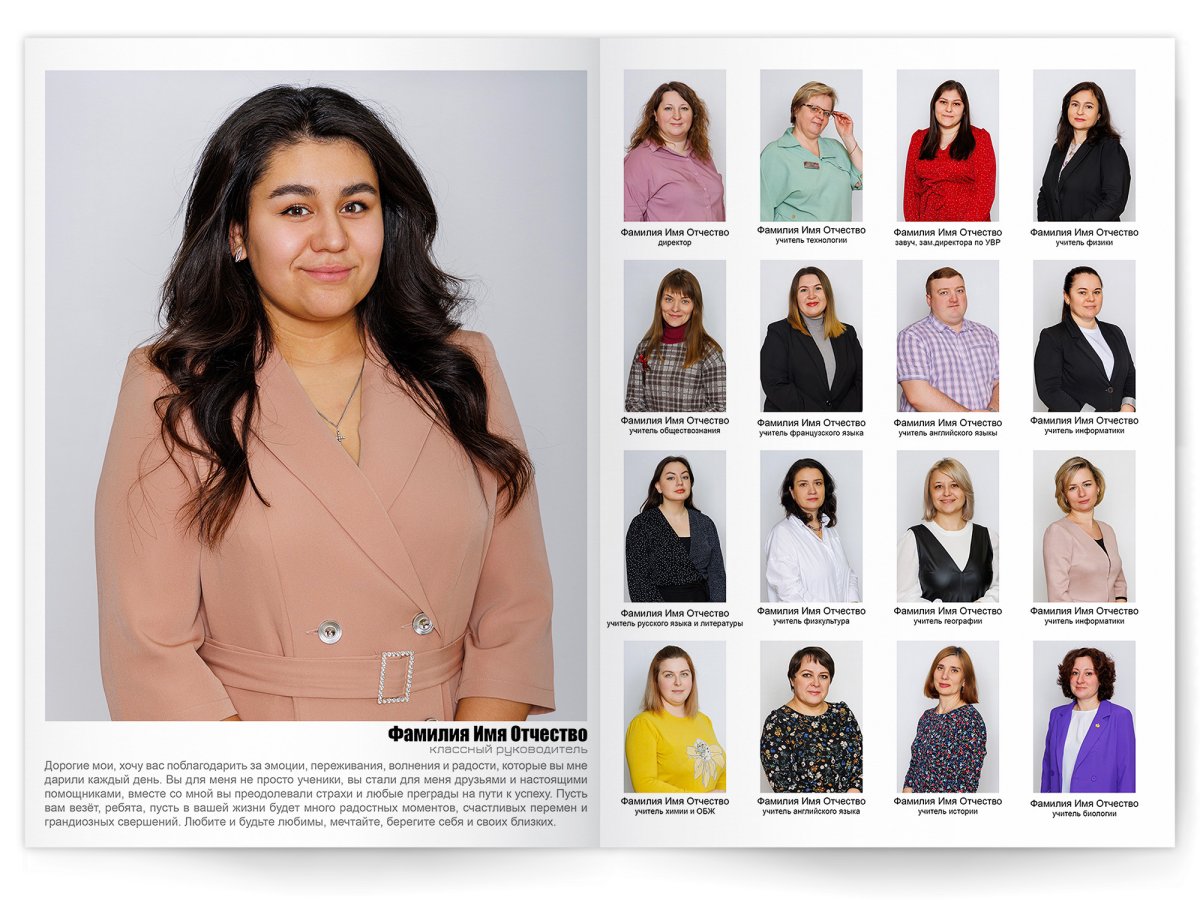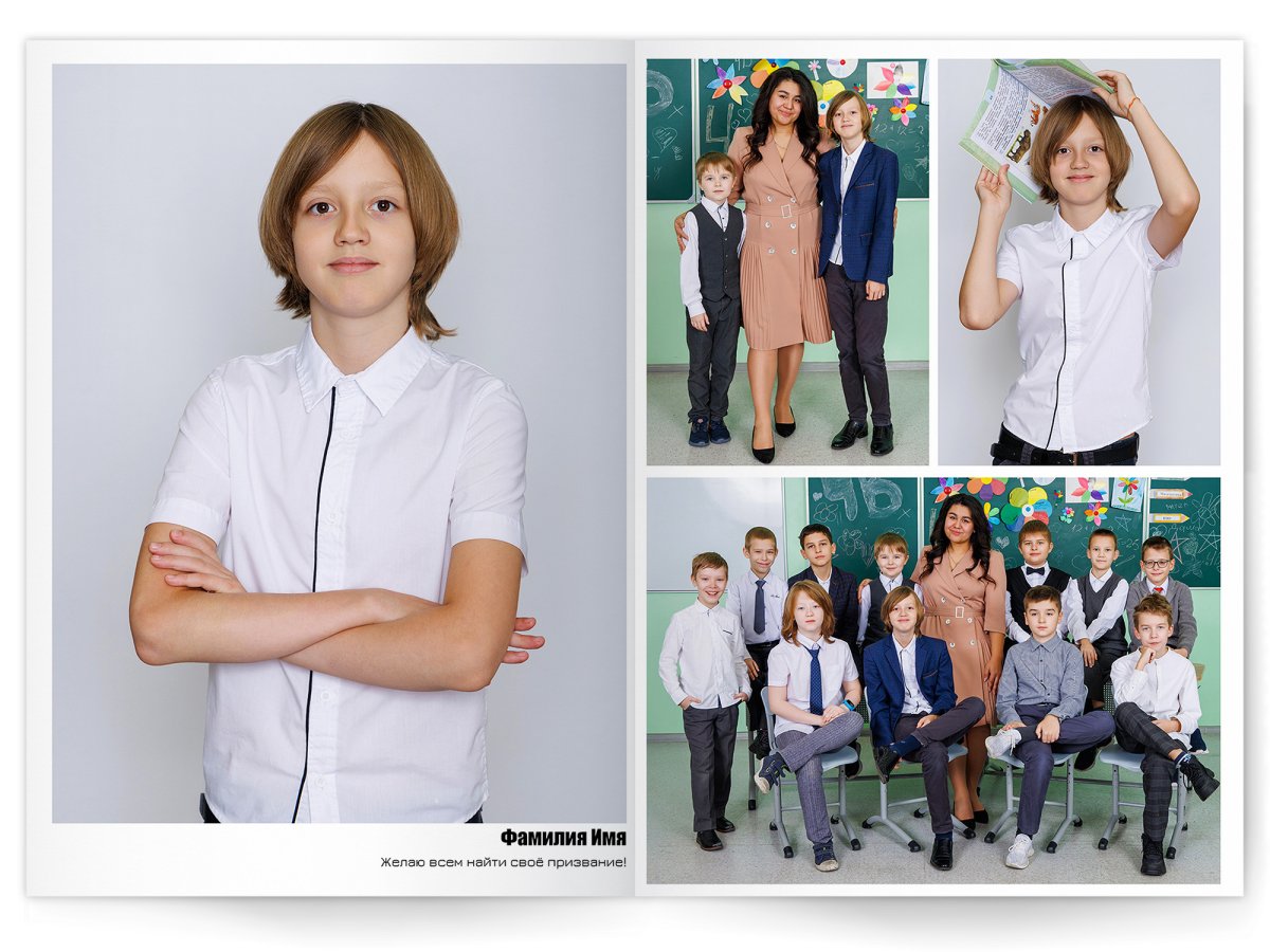 • Портреты всех одноклассников и все учителя, которые придут на съёмку на развороте