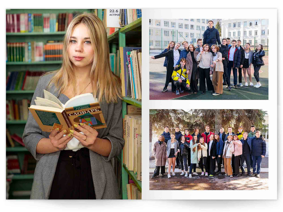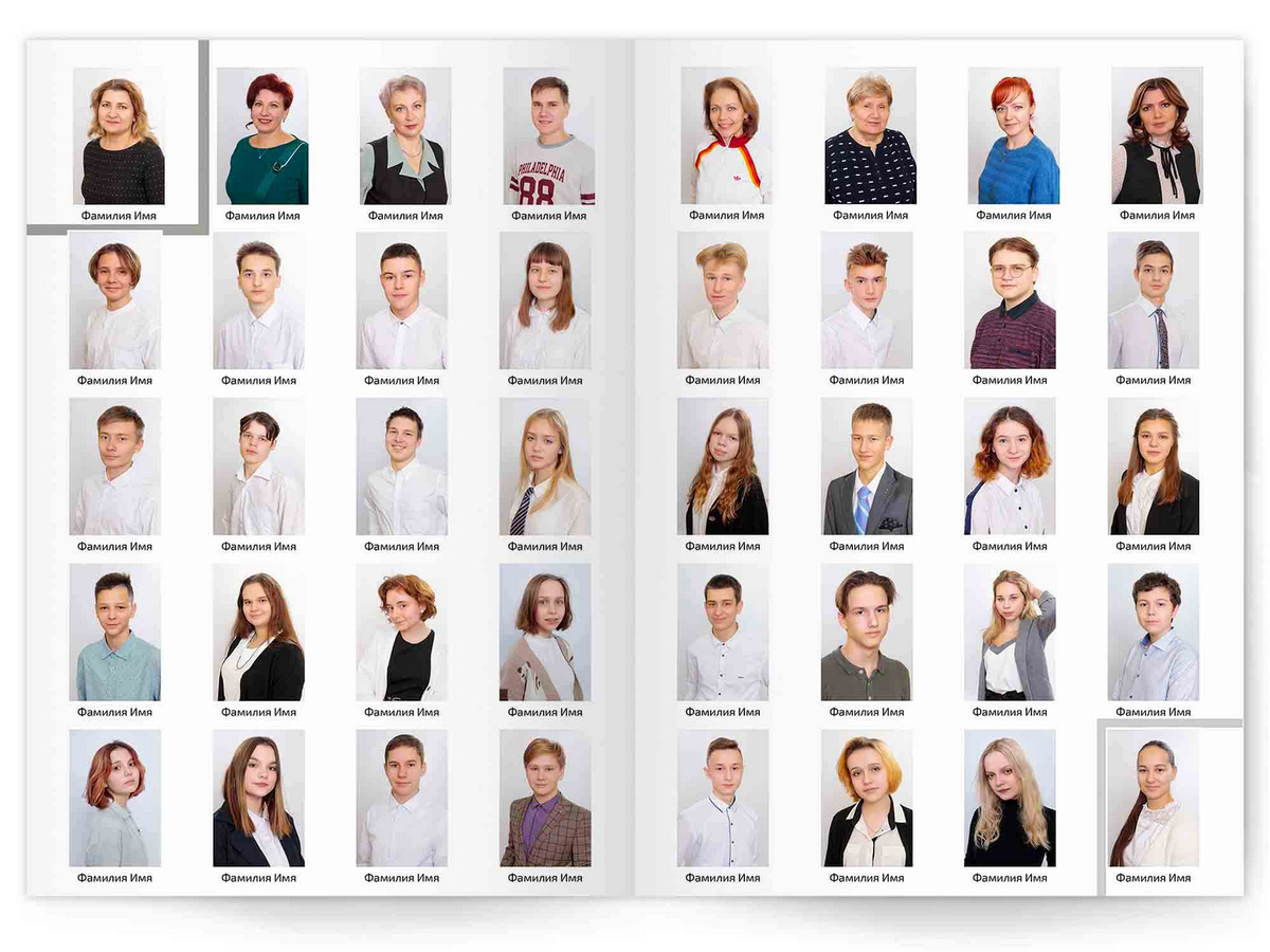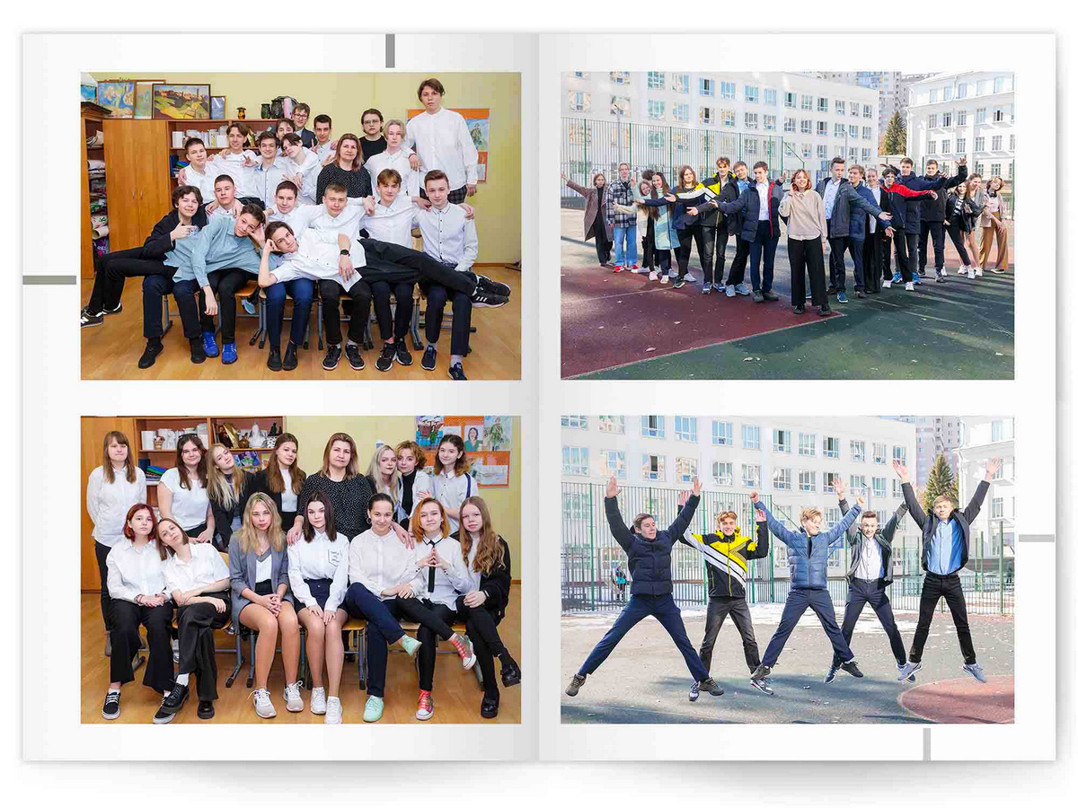• Портреты всех одноклассников и все учителя, которые придут на съёмку на развороте
