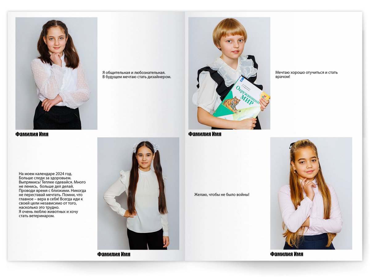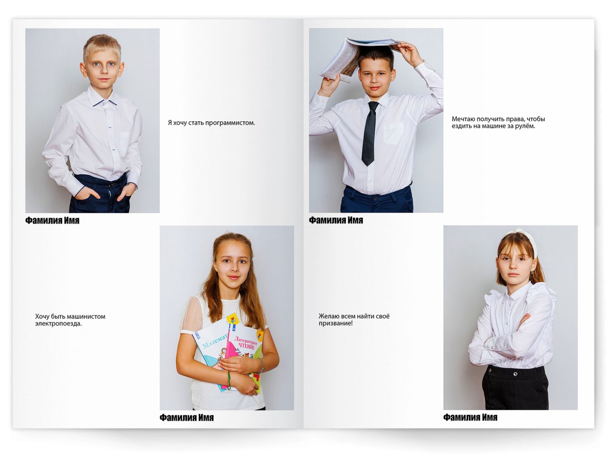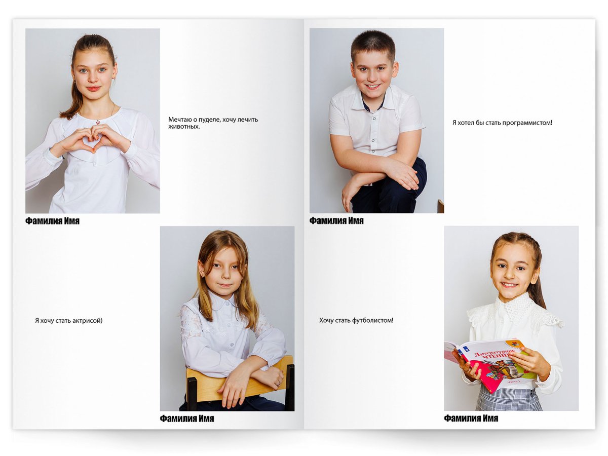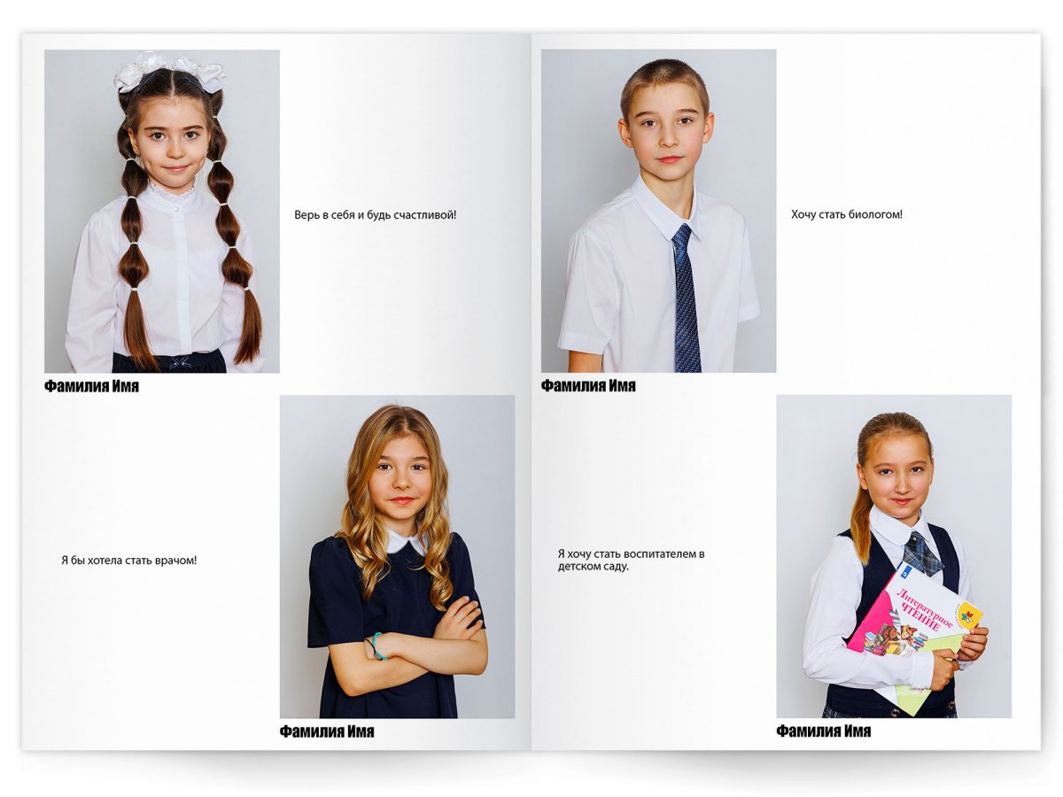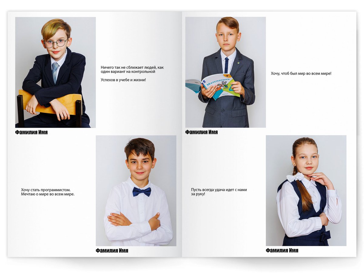 • Портреты всех одноклассников и все учителя, которые придут на съёмку на развороте
