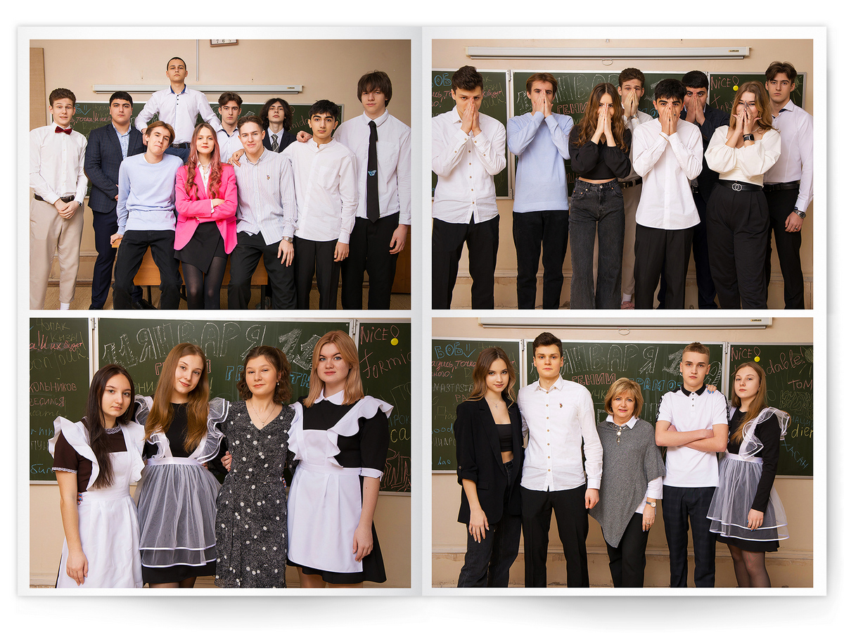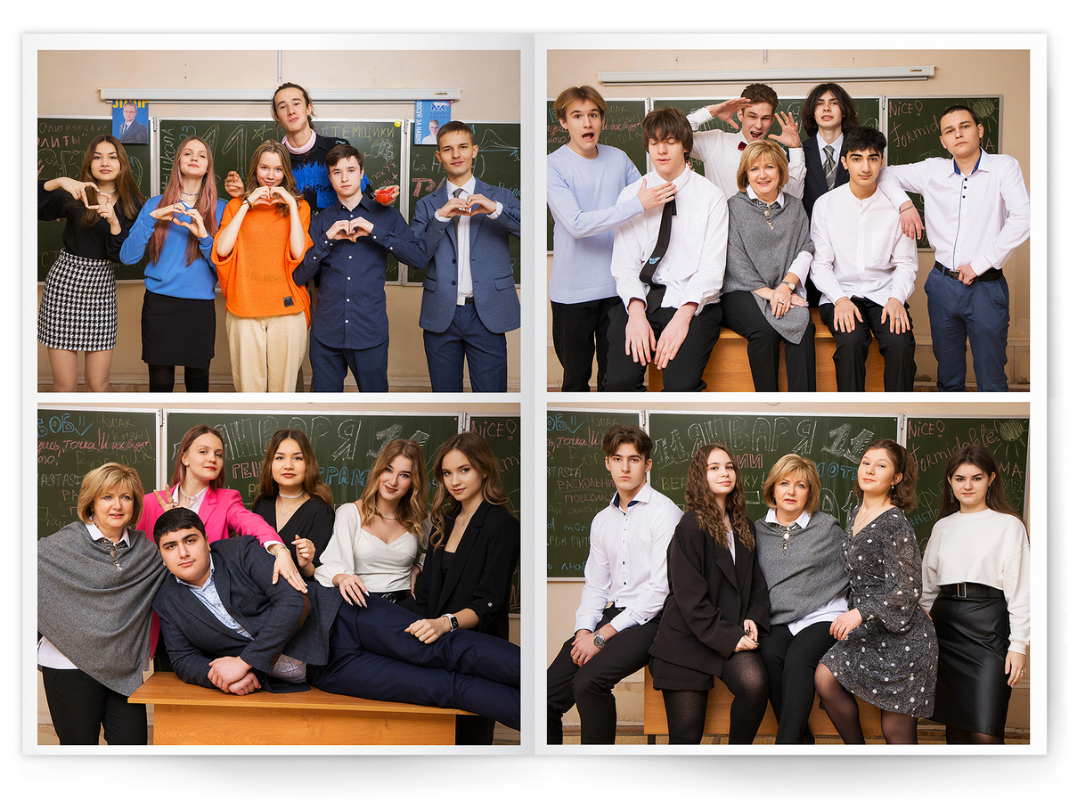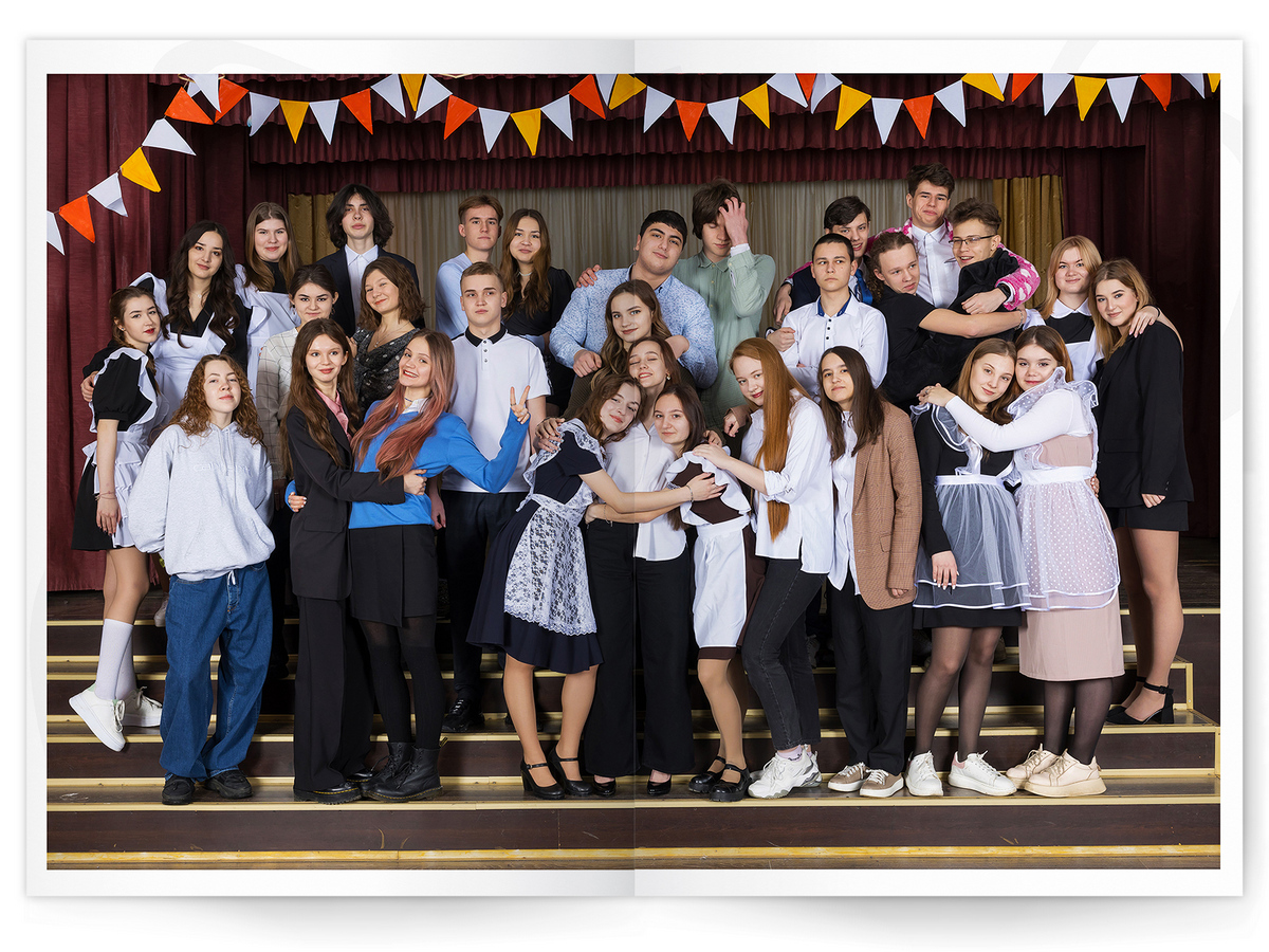 • Портреты всех одноклассников и все учителя, которые придут на съёмку на развороте