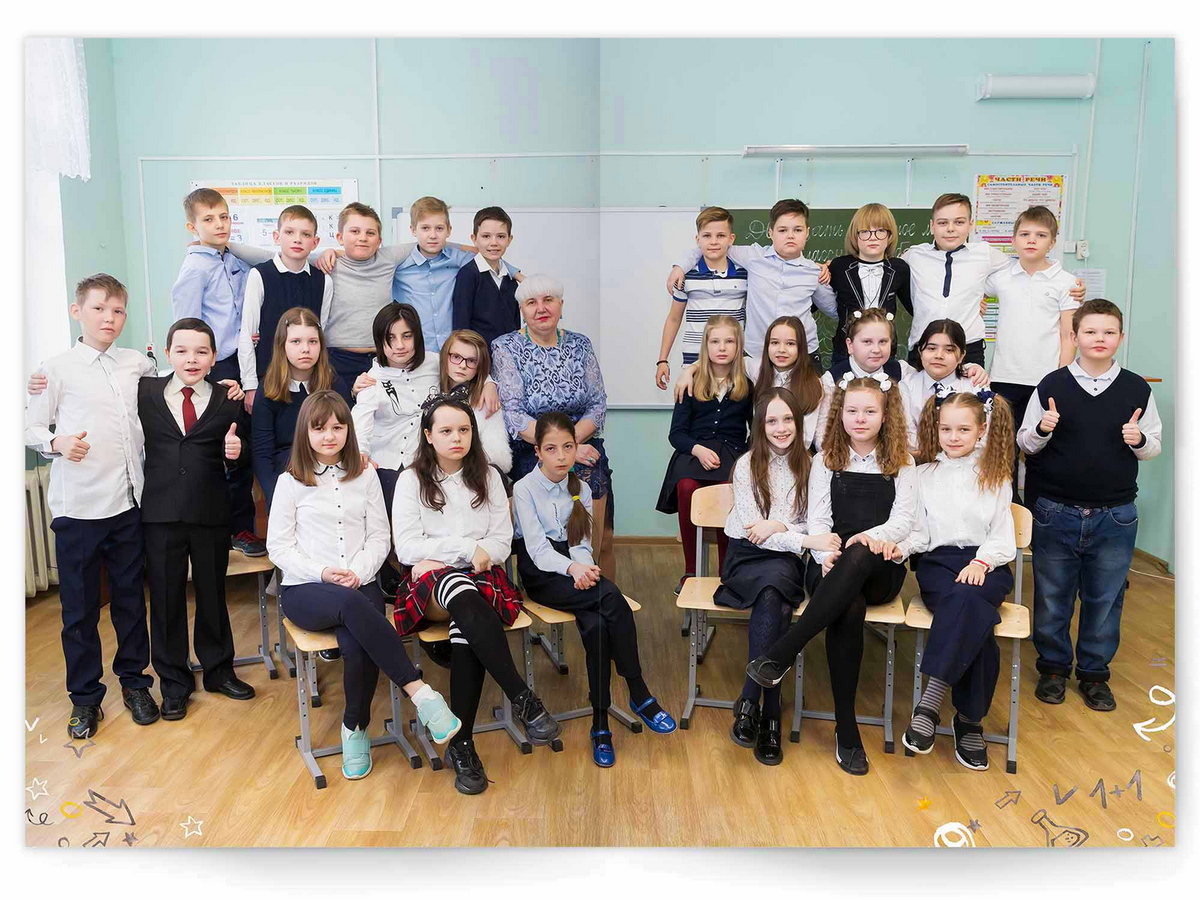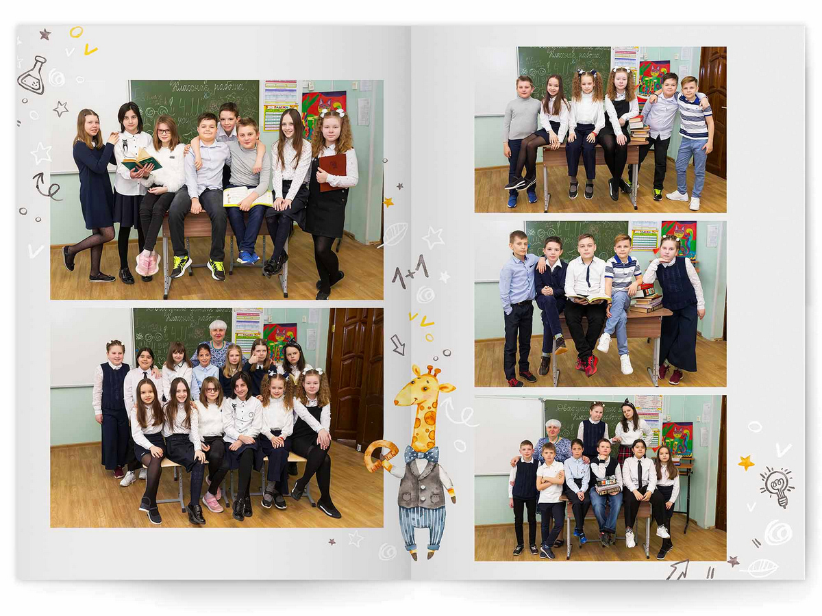 • Можно добавить общее фото всего класса на разворот +350 ₽