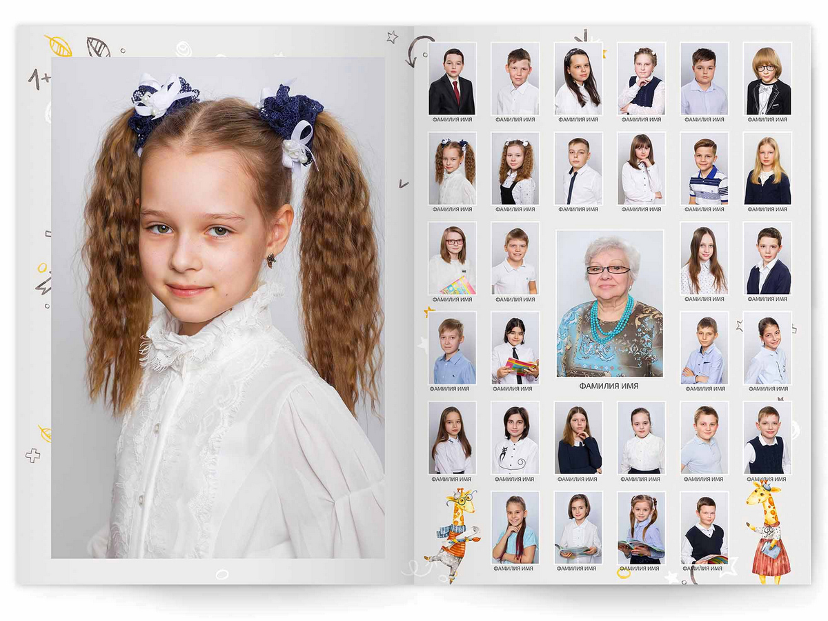 • Портреты всех одноклассников и все учителя, которые придут на съёмку на развороте