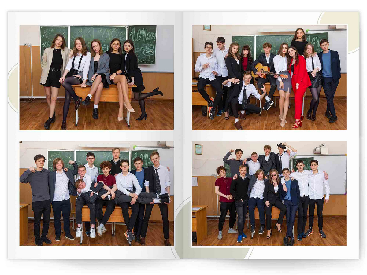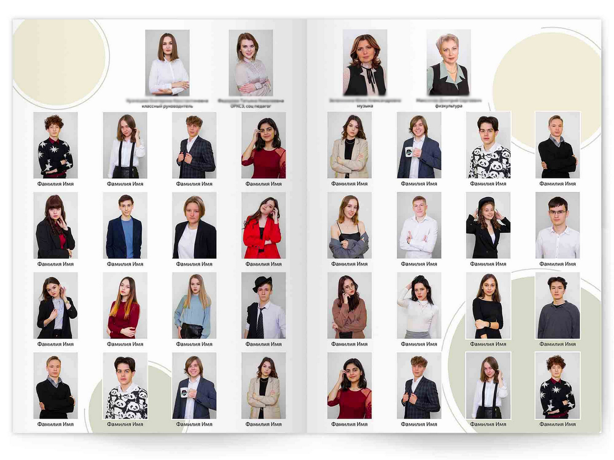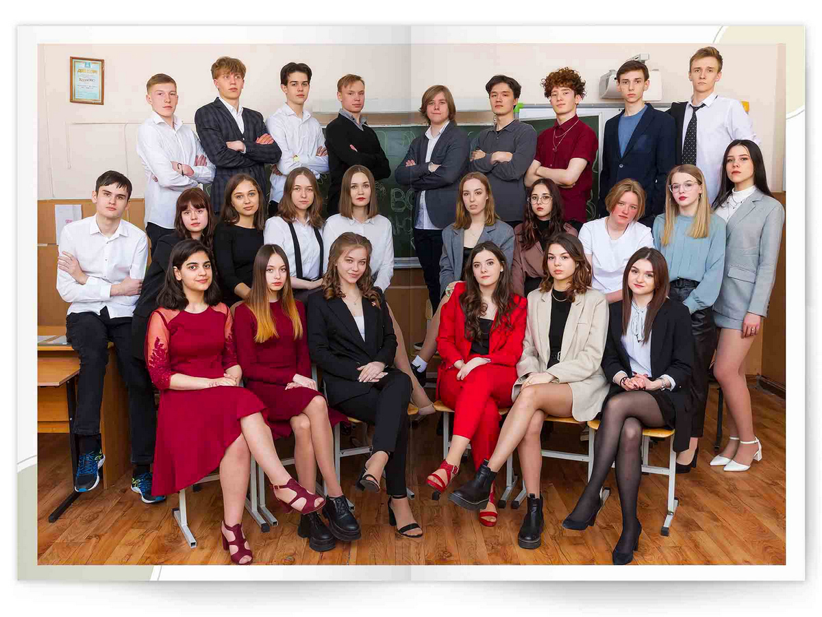 • Портреты всех одноклассников и все учителя, которые придут на съёмку на развороте