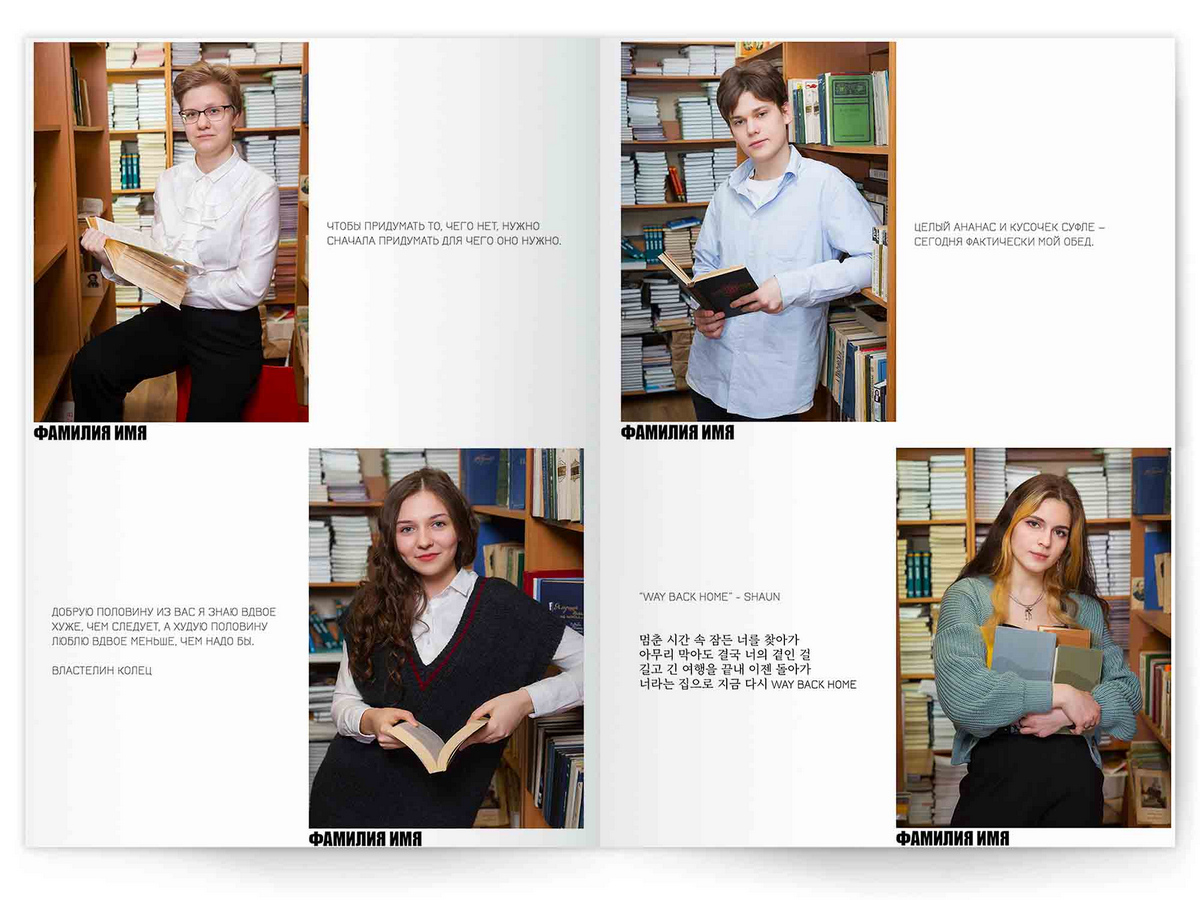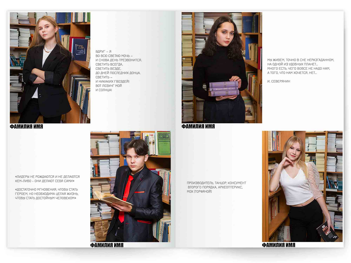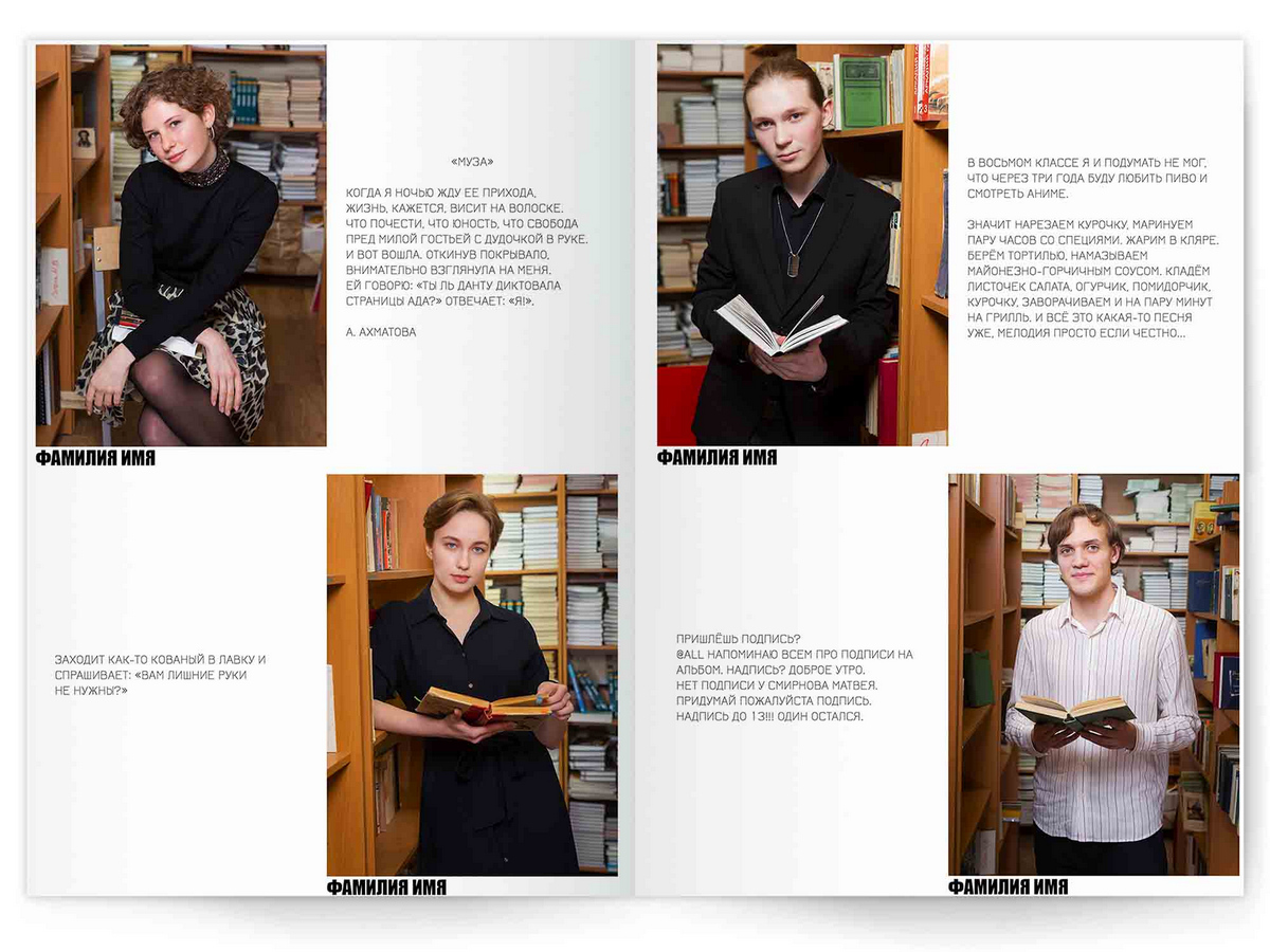• Портреты всех одноклассников по 2 человека на страницу с историями-заметками, цитатами для выпускного альбома