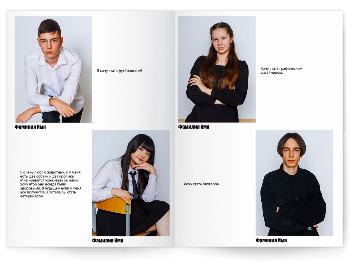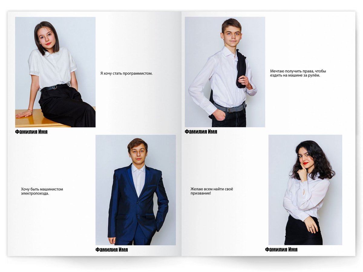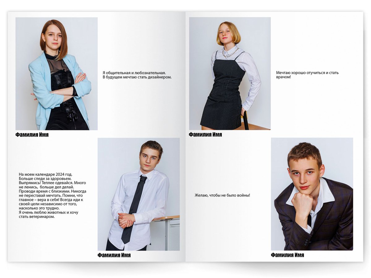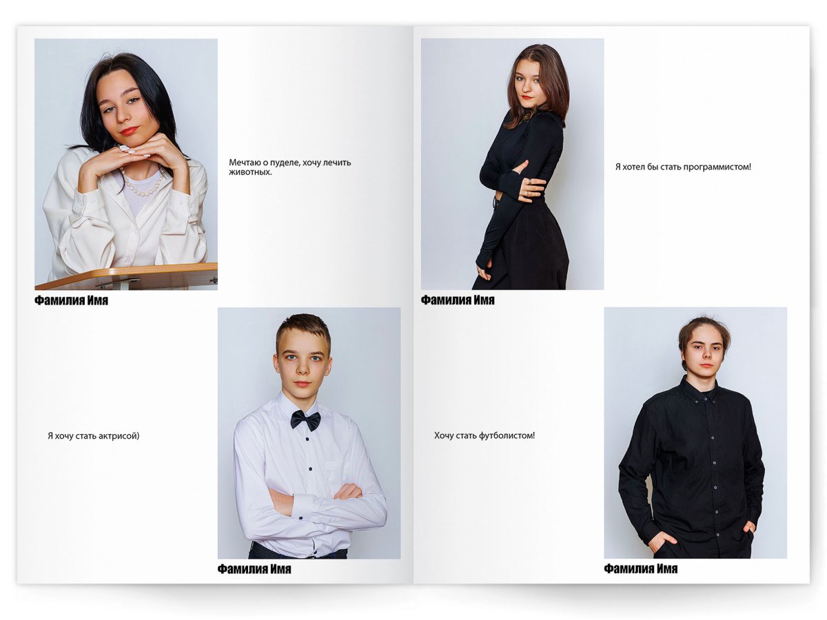 - Портреты всех одноклассников и все учителя, которые придут на съёмку на развороте