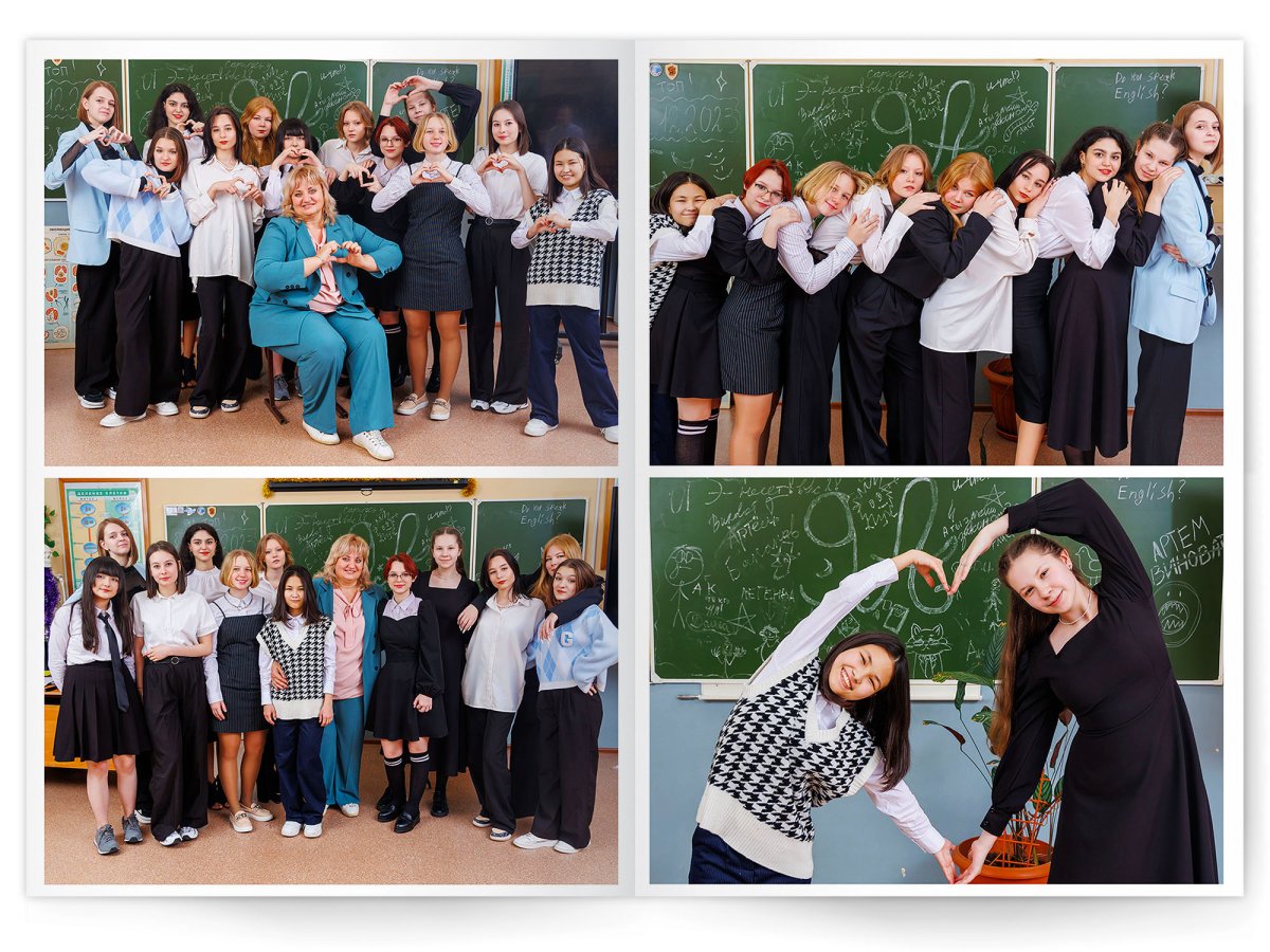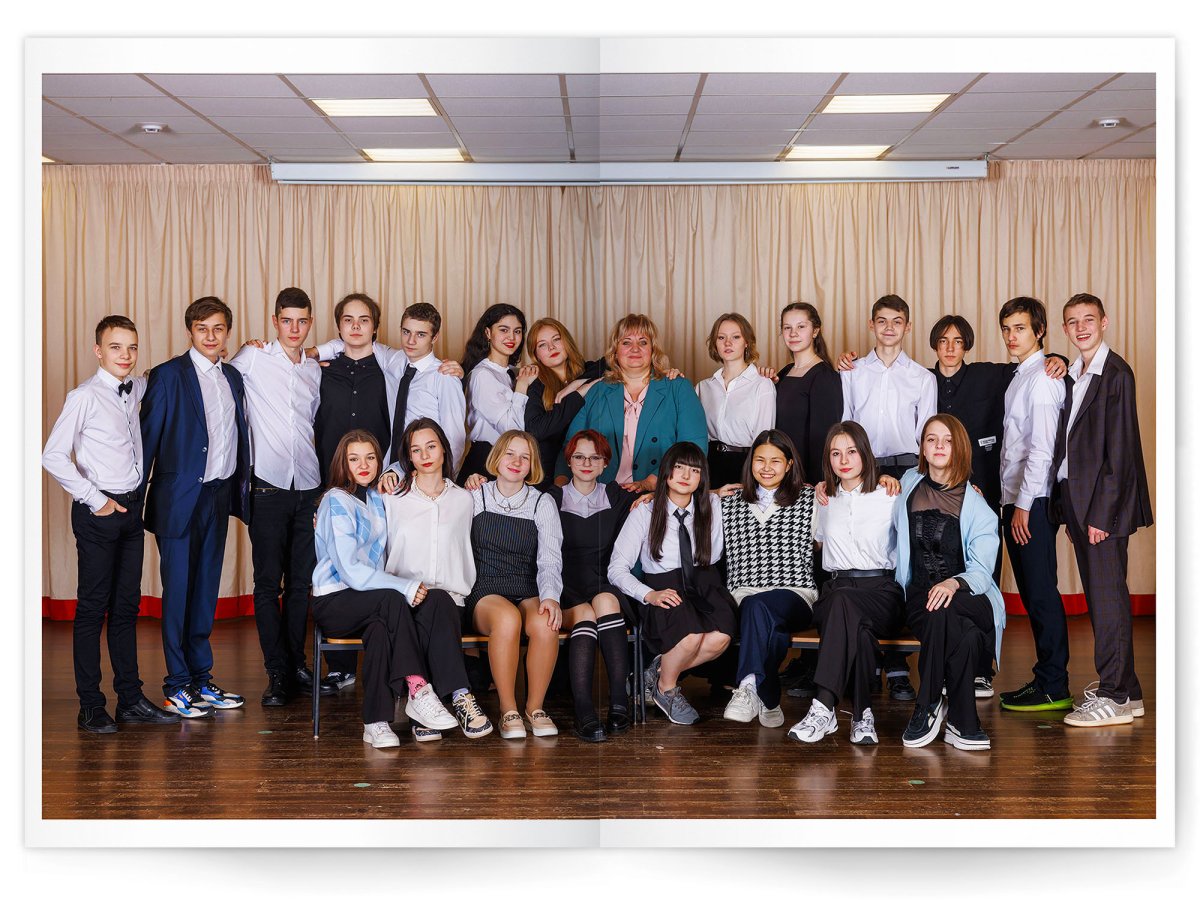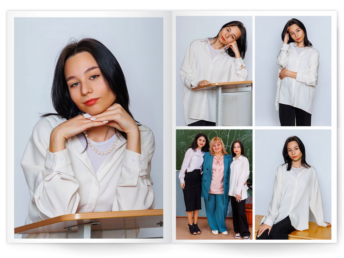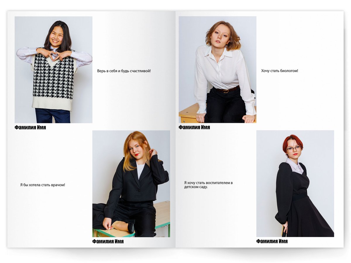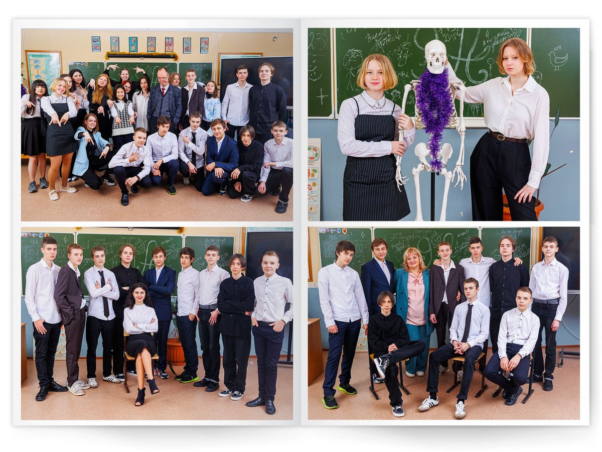 - Портреты всех одноклассников и все учителя, которые придут на съёмку на развороте