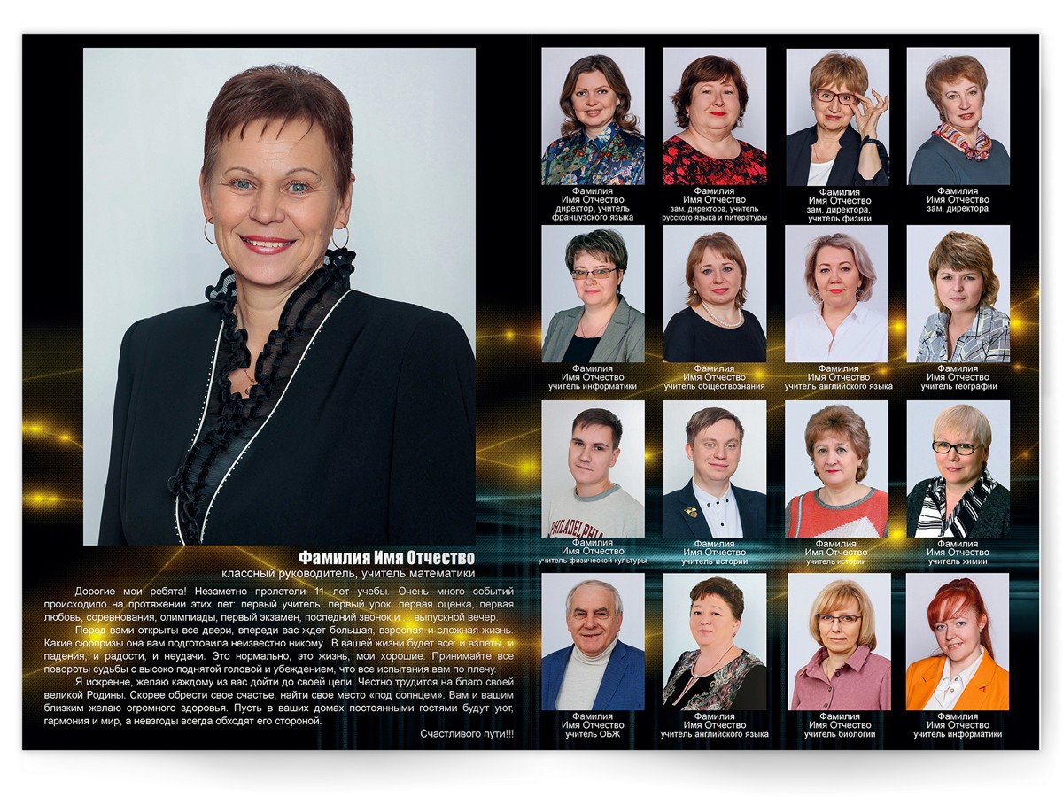 • Портреты всех одноклассников и классного руководителя на развороте или второй портрет на всю страницу слева, справа портреты всех одноклассников и классного руководителя
