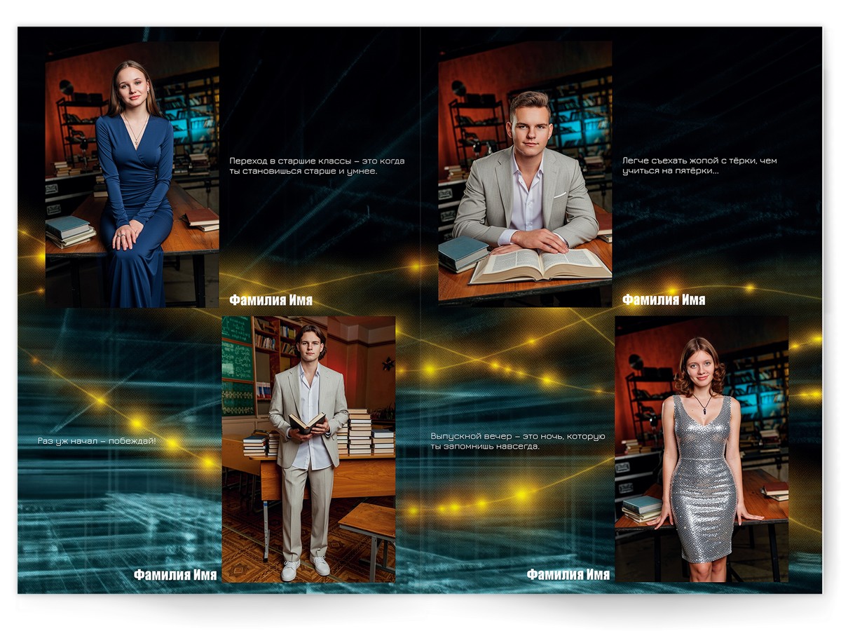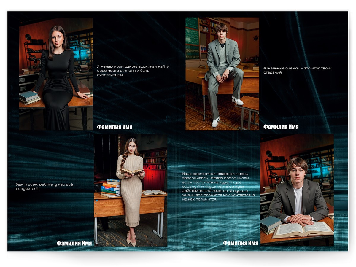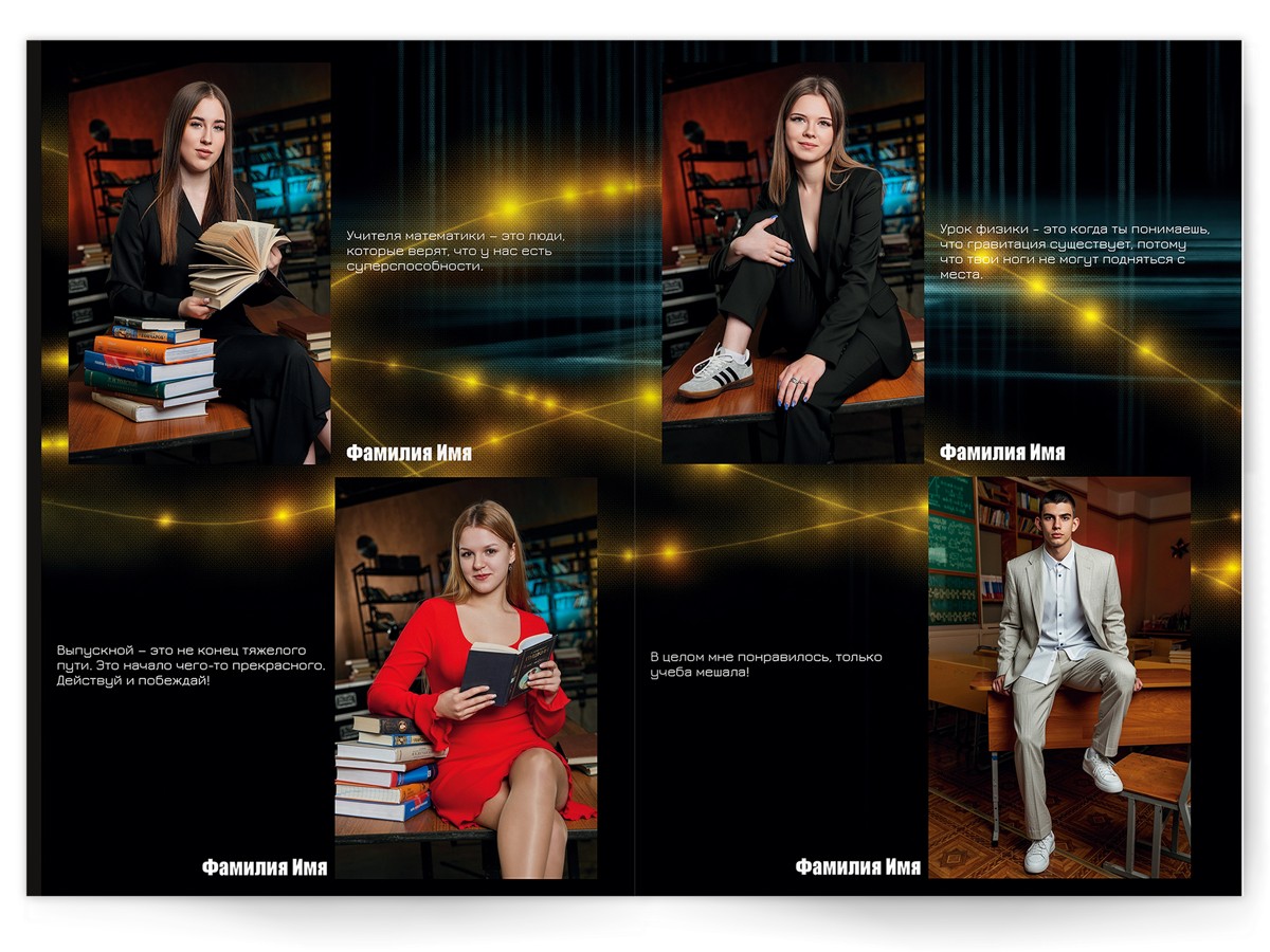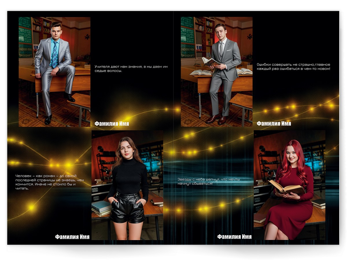 • Портреты всех одноклассников по 2 человека на страницу с историями-заметками, цитатами для выпускного альбома