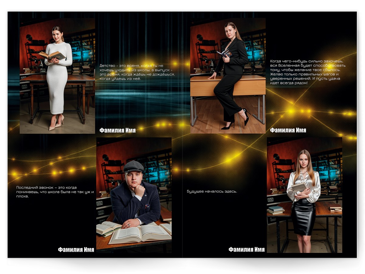 • Портреты всех одноклассников и все учителя, которые придут на съёмку на развороте